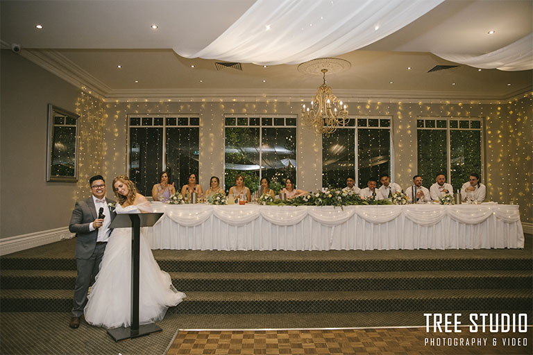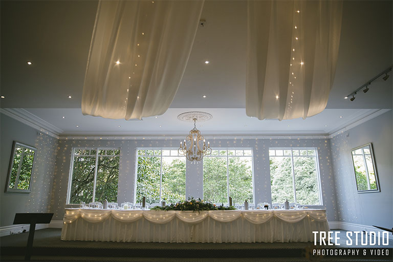 Decorations: Melbourne Wedding Designers (ceiling and bridal table draping, fairy lights)